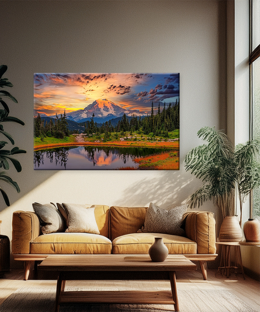 Bring the power of nature indoors with this canvas wall art, featuring a glowing mountain peak, vibrant forests, and a tranquil reflective lake. Discover the majesty of the wilderness with the Fiery Peak Reflections Canvas Wall Art. This breathtaking scene...