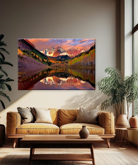 Experience the breathtaking beauty of autumn mountains with this canvas wall art, showcasing fiery crimson peaks mirrored in a tranquil lake. Bring the grandeur of the mountains into your home with this Crimson Peaks Reflection Canvas Wall Art. Featuring majestic...
