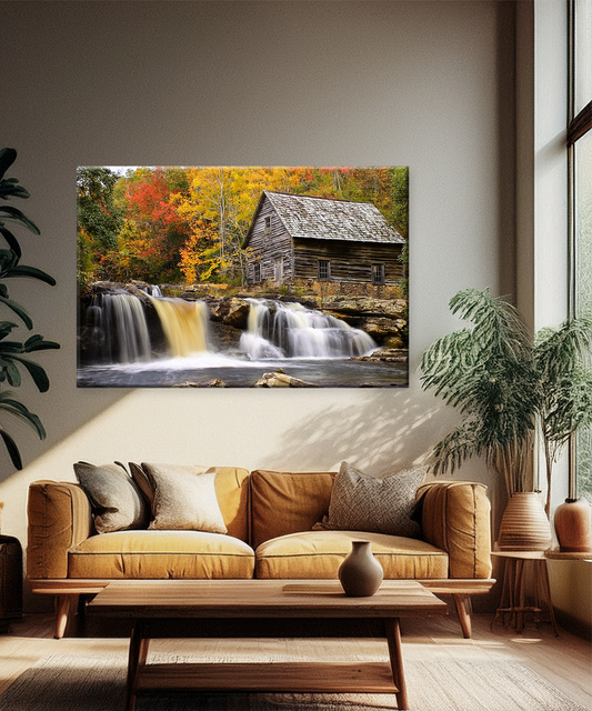 A rustic watermill beside a cascading waterfall surrounded by golden autumn foliage, captured in serene detail. Bring the peaceful charm of the countryside into your home with Autumn Mill Serenity, a breathtaking waterfall landscape canvas. This artwork showcases an old...