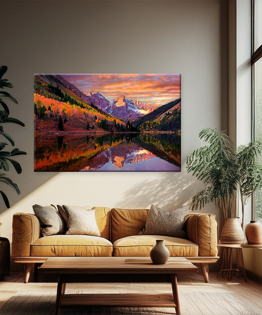 Golden autumn forests and majestic snow-capped peaks reflected perfectly in a tranquil mountain lake. Experience the breathtaking beauty of the wilderness with Autumn Mirror, a captivating mountain landscape canvas. This artwork showcases towering, snow-dusted peaks illuminated by the soft glow...