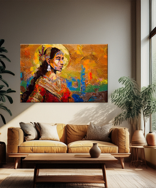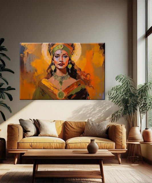 Step into the aura of timeless elegance with Mystic Heritage, a striking abstract portrait infused with cultural richness and divine mystique. The bold strokes of crimson, gold, and earthy tones bring to life the regal figure adorned in traditional attire,...