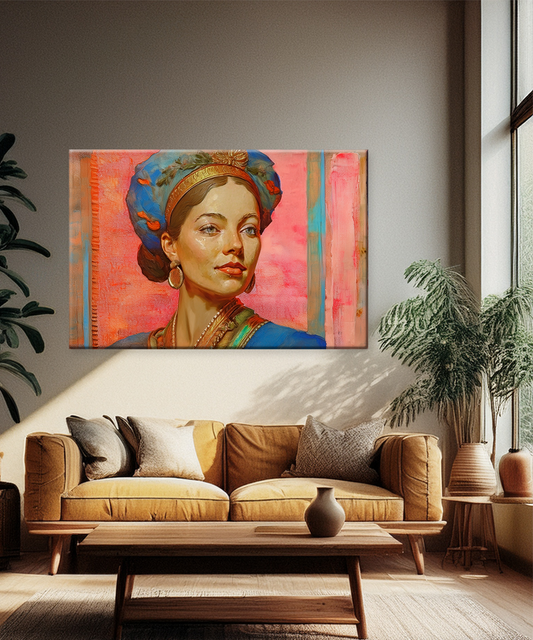 Timeless Grace is a radiant portrait that embodies elegance, strength, and dignity. The woman, adorned in rich fabrics, golden jewelry, and a regal blue headpiece, gazes forward with serene confidence. The warm coral background enhances the vibrancy of her expression,...