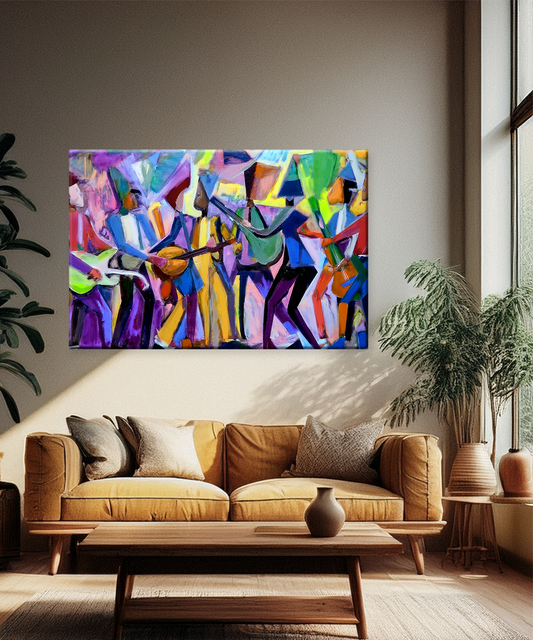 Celebrate the rhythm of life with Festival of Shapes, a vibrant abstract artwork that bursts with movement, color, and energy. Featuring faceless musicians painted in bold geometric forms, this canvas captures the raw joy of music and dance. The dynamic...