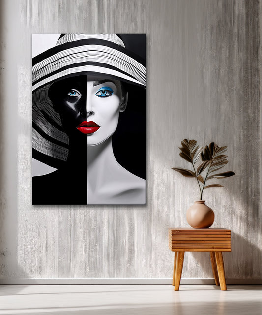 Add timeless sophistication to your space with Dual Elegance, a striking black-and-white fashion-inspired portrait. Featuring bold contrasts, vivid blue eyes, and dramatic red lips, this artwork creates a statement of style and power. Printed with Epson printers using Chrome 12...