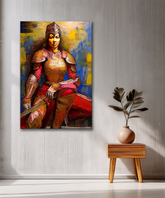 “Warrior’s Reverie” is a powerful canvas artwork that captures the strength and determination of a female knight in radiant red armor. The textured brushstrokes, luminous gold accents, and commanding pose create a timeless tribute to resilience, honor, and courage. Printed...