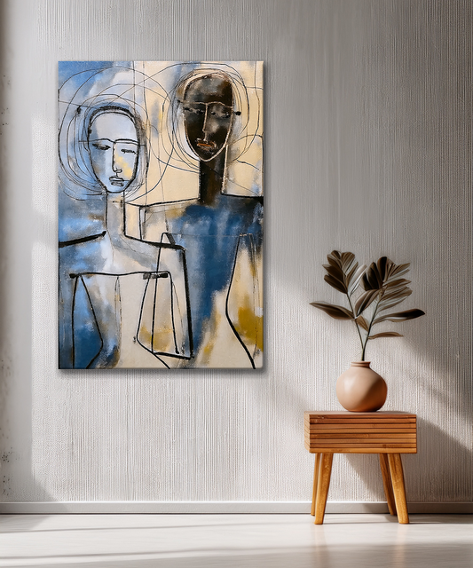 ilent Figures is a minimalist abstract canvas featuring two stylized human forms in calm, muted tones of blue, beige, and black. Printed with Epson printers using Chrome 12 inks, it ensures vivid detail and fade resistance for up to 200...