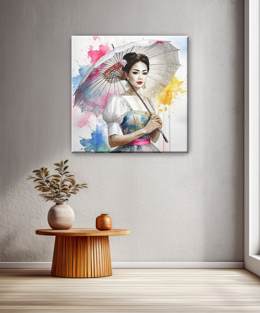 Celebrate timeless elegance with this exquisite portrait canvas wall art, featuring a graceful woman holding a lace umbrella against a backdrop of watercolor splashes. The delicate blend of tradition and modern artistry creates a captivating visual harmony. Printed with Epson...