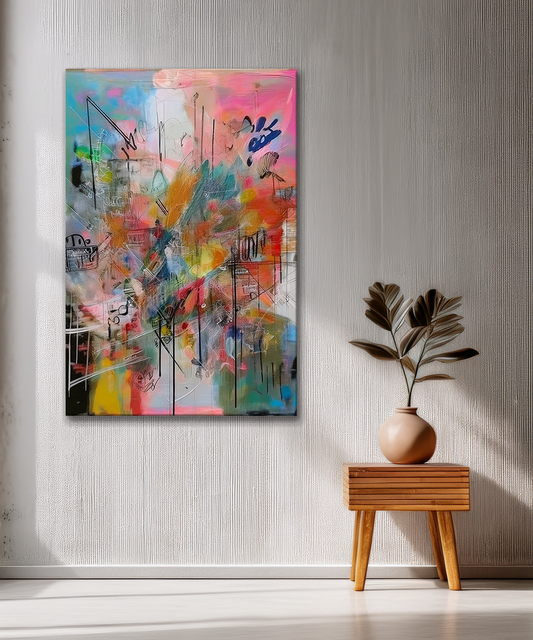 This expressive abstract canvas wall art bursts with vibrant colors, dynamic textures, and layered markings, evoking energy and movement. Printed with Epson printers using Chrome 12 inks, it maintains its brilliance and remains fade-resistant for up to 200 years. A...
