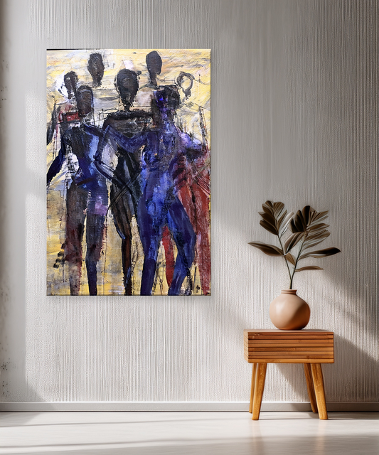This expressive abstract canvas wall art depicts human silhouettes in motion, painted in deep blues, blacks, and earthy tones. Printed with Epson printers using Chrome 12 inks, it preserves its intensity and remains fade-resistant for up to 200 years. A...