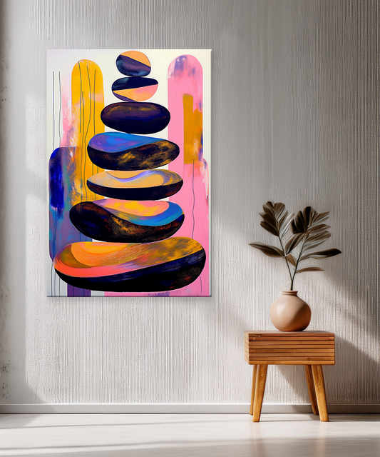 This modern abstract canvas wall art features a vibrant stack of stones in bold colors of orange, pink, blue, and gold. Printed with Epson printers using Chrome 12 inks, it ensures lasting vibrancy and fade resistance for up to 200...