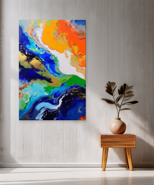This vibrant abstract canvas wall art captures the essence of flowing elements with bold blues, fiery oranges, and lush greens. Printed with Epson printers using Chrome 12 inks, it guarantees vivid colors that stay radiant and fade-resistant for up to...