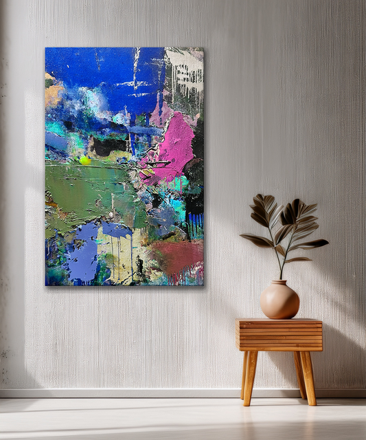 This textured abstract canvas wall art features bold layers of blue, green, pink, and black, evoking the energy of urban landscapes. Printed with Epson printers using Chrome 12 inks, it ensures lasting brilliance and fade resistance for up to 200...