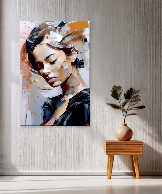A stunning abstract portrait, this canvas captures a woman’s serene expression through bold brushstrokes and layered textures in warm earthy tones. Its fragmented style creates depth and modern elegance. Printed with Epson technology and Chrome 12 pigment inks, the artwork...