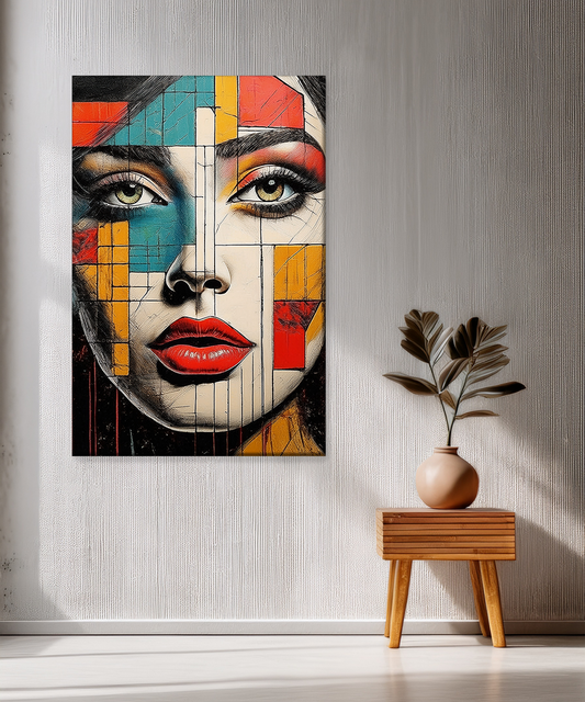 This bold and vibrant canvas captures a striking female face framed with geometric blocks of red, yellow, teal, and orange. The sharp contrasts and piercing green eyes create a powerful statement piece for modern interiors. Printed with Epson technology and...