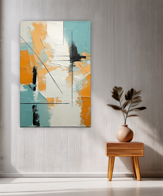 A refined interplay of turquoise, warm ochre, and soft ivory tones, balanced with sleek black lines that create structure and rhythm. This modern abstract design exudes harmony and sophistication, making it an elegant statement piece for contemporary interiors. Produced with...