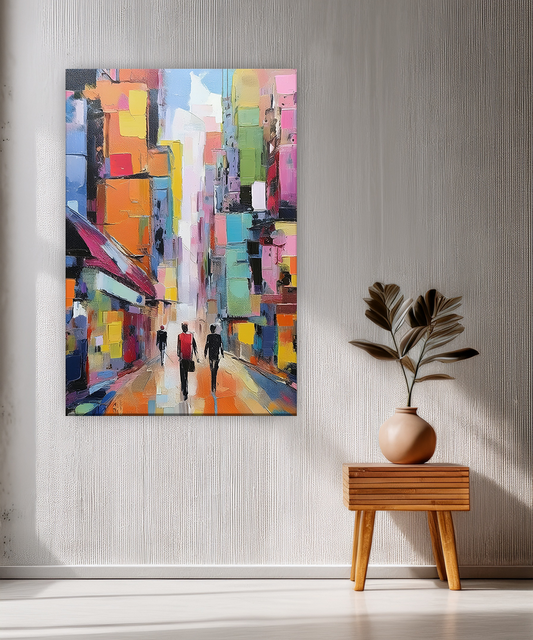A dazzling cityscape alive with energy and movement, this artwork captures the vibrancy of modern urban life through bold brushstrokes and a kaleidoscope of colors. The silhouettes walking among towering blocks of vivid hues evoke a sense of motion, diversity,...