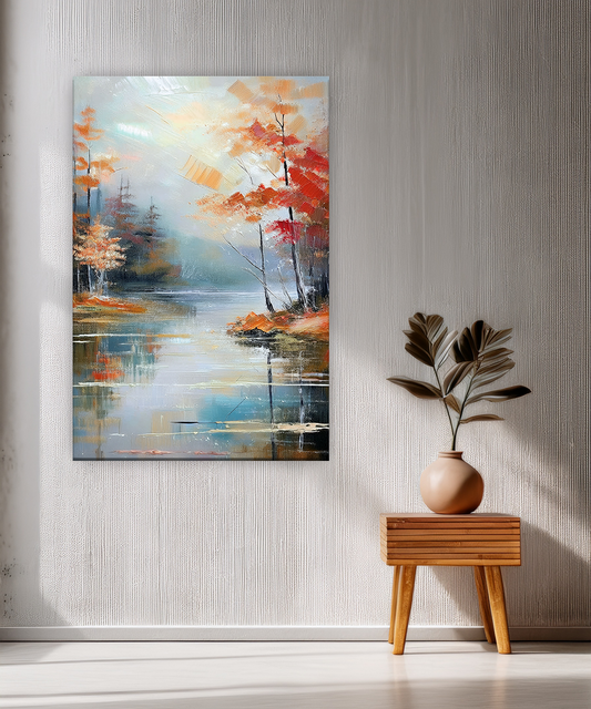 A tranquil autumn landscape alive with warm tones of red, gold, and orange reflecting over a calm lake. The misty backdrop and soft brushstrokes create a peaceful, dreamlike atmosphere, bringing the beauty of fall directly into your living space. Printed...