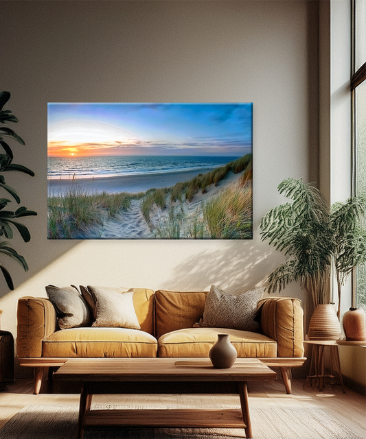 Add coastal charm to your home with this canvas wall art, featuring sandy dunes, tall grasses, and a serene ocean sunset view. Capture the peaceful beauty of the shore with the Dunes at Sunset Canvas Wall Art. This stunning seascape...