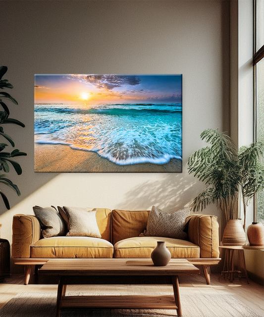 Bring ocean energy to your home with this canvas wall art, featuring glowing sunset light over crashing waves on a sandy shore. Experience the beauty of the sea with the Golden Horizon Waves Canvas Wall Art. This vibrant seascape captures...