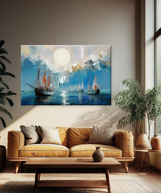 Add nautical elegance to your home with this canvas wall art, featuring abstract sailboats under a glowing sky in a textured coastal painting. Bring a sense of adventure and artistry into your décor with the Ocean Cliffs Canvas Wall Art....