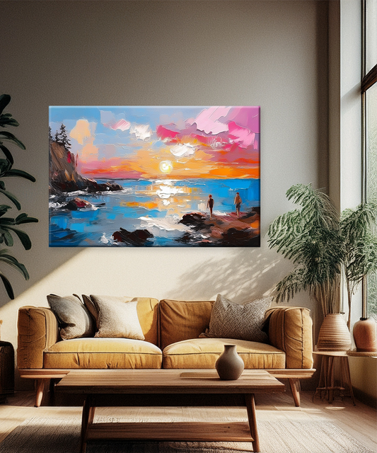 Add artistic warmth to your space with this canvas wall art, featuring a colorful sunset reflected over the ocean in a textured painting style. Immerse your walls in color and tranquility with the Mirrors of the Sea Canvas Wall Art....