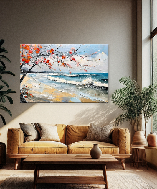 Bring artistic elegance to your space with this coastal canvas wall art, featuring ocean waves, sandy shores, and blooming blossoms in a textured painting style. Celebrate the harmony of sea and art with the Falling Colors Canvas Wall Art. This...