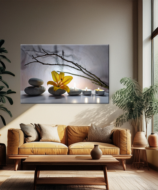 A serene canvas artwork featuring stones, candles, and a lily flower – perfect for mindfulness and meditation spaces. Create a sanctuary of calm and balance with the Zen Harmony Canvas. This soothing artwork showcases stacked stones, glowing candles, and a...
