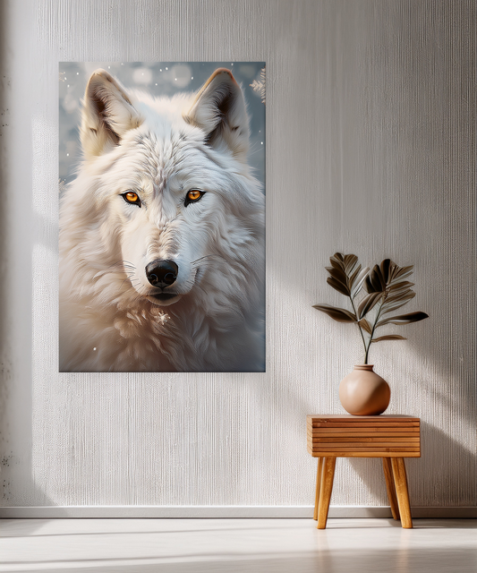 A mesmerizing portrait of a white wolf with golden eyes, symbolizing wisdom and strength. Printed on premium canvas with Epson printers and Chrome 12 pigment inks, this artwork offers unmatched clarity and fade resistance for up to 200 years. Invite...