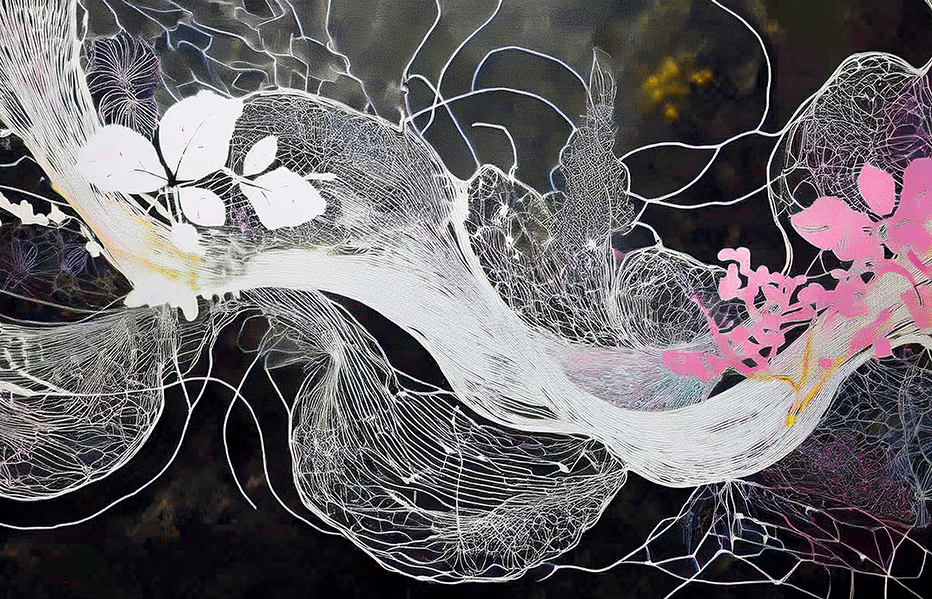 A modern abstract canvas featuring intricate white linework and delicate pink floral highlights over a dark background.