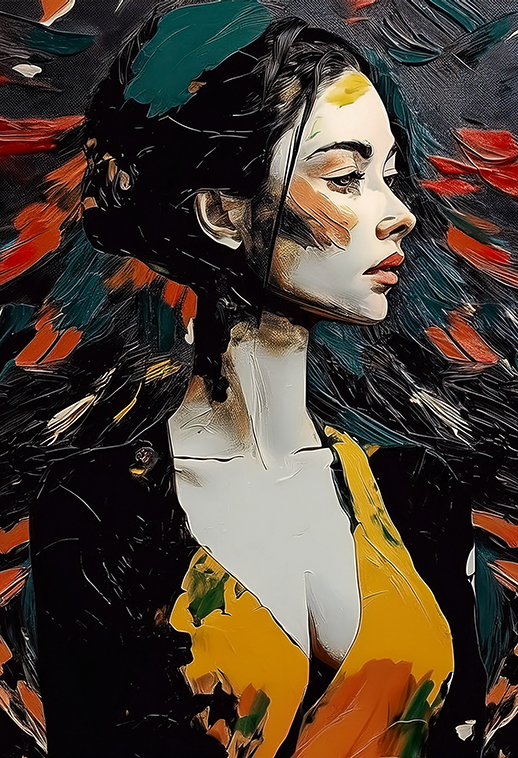 A striking portrait infused with bold textures and vibrant contrasts, this artwork blends realism with expressive abstraction. The figure’s serene profile, framed by flowing strokes of deep red, green, and gold, radiates elegance and strength—making it a captivating statement piece for modern interiors.