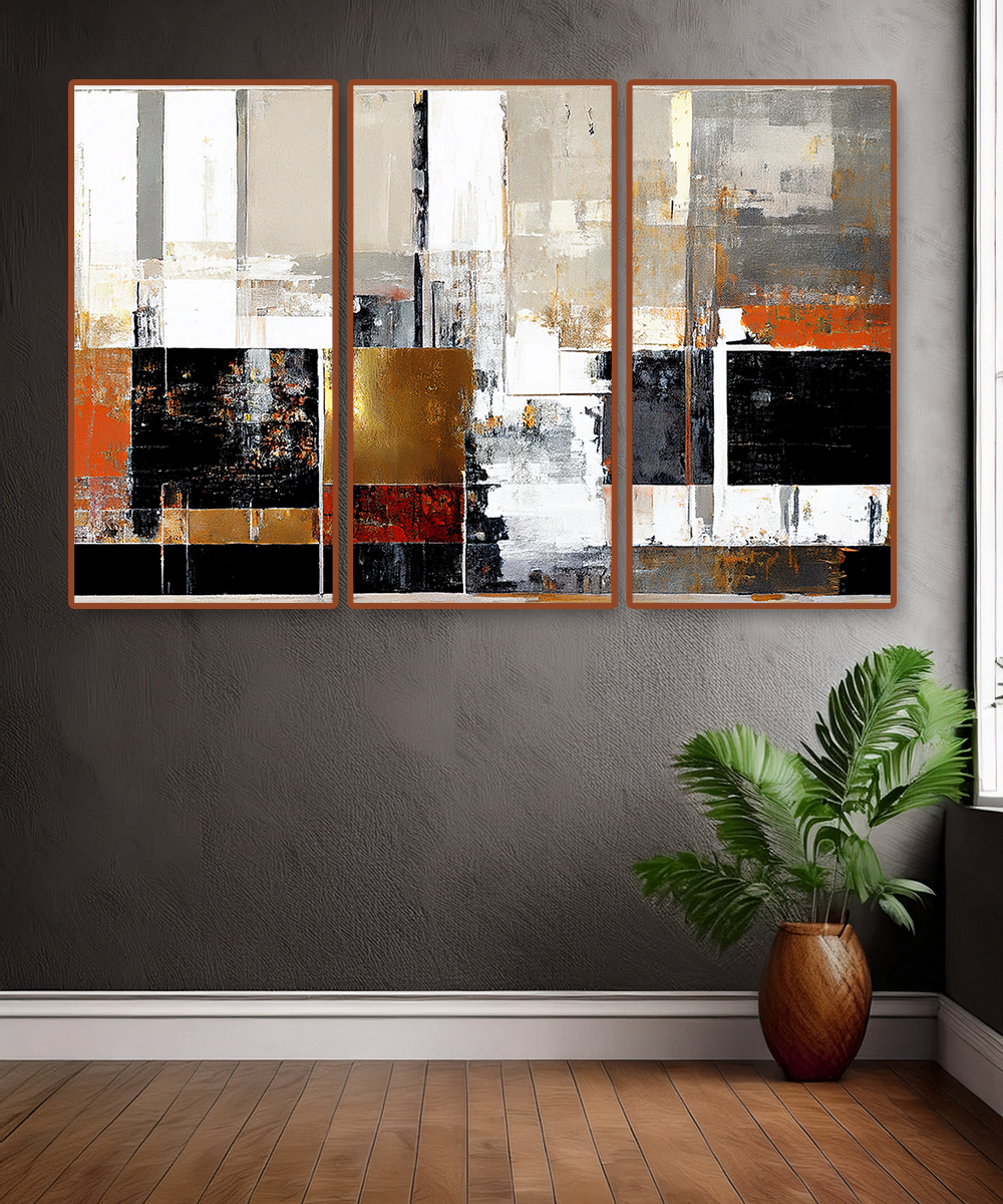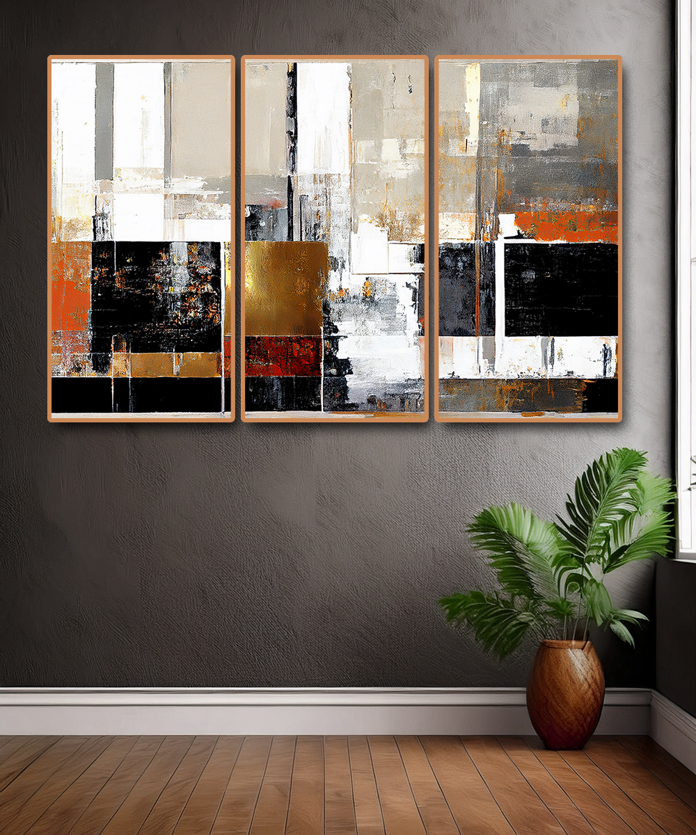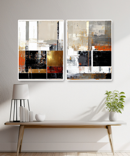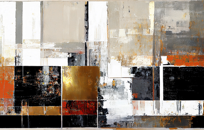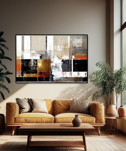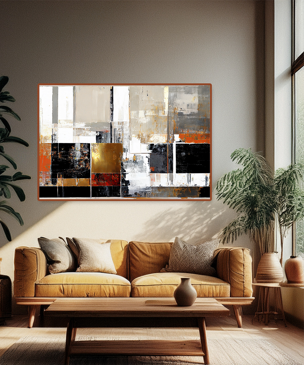 Bring modern sophistication to your walls with the Chain Reaction Geometric Abstract Canvas. Featuring a structured composition of rectangles and bold color blocks in metallic gold, deep black, vibrant rust, and soft neutrals, this artwork blends order and energy in perfect balance.