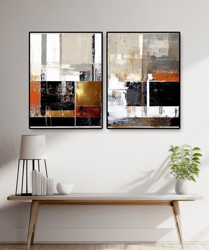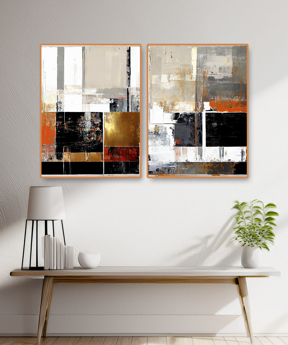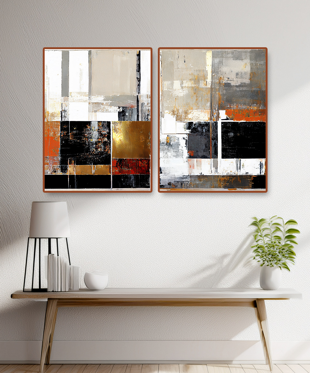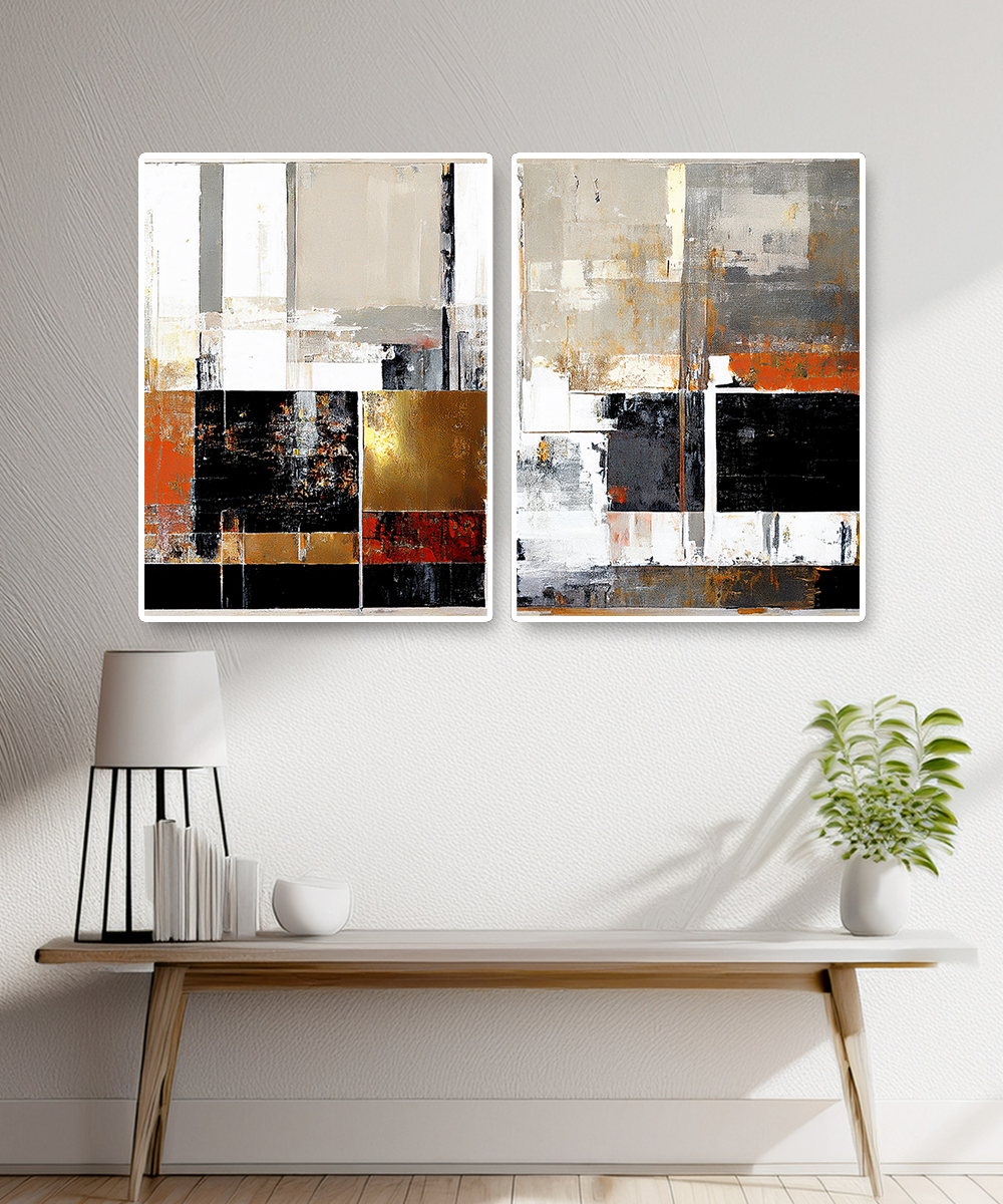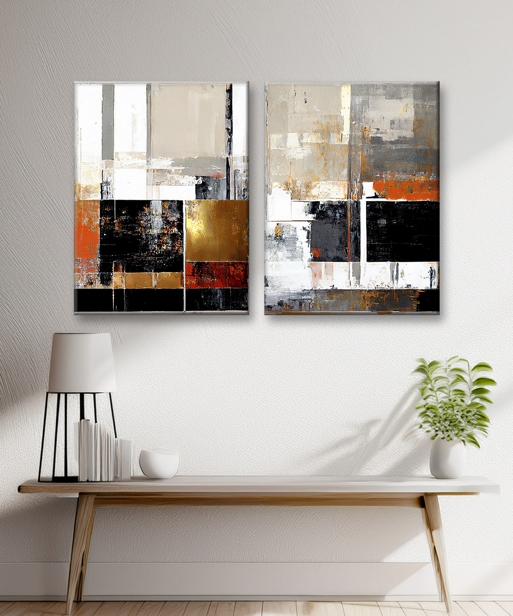 Bring modern sophistication to your walls with the Chain Reaction Geometric Abstract Canvas. Featuring a structured composition of rectangles and bold color blocks in metallic gold, deep black, vibrant rust, and soft neutrals, this artwork blends order and energy in perfect balance.