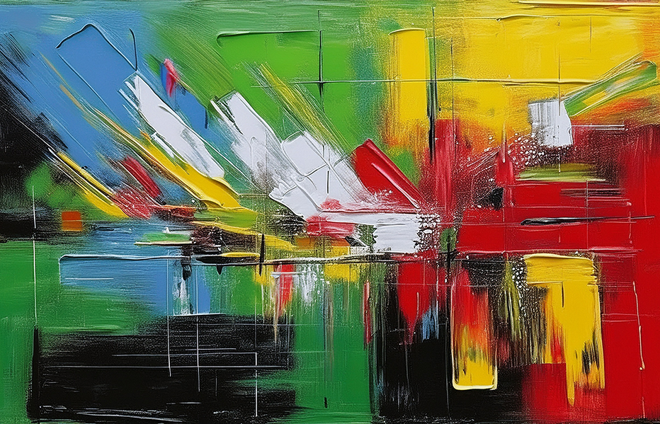 Energetic abstract artwork with vibrant strokes of red, yellow, green, and blue, a striking addition to modern interiors.
