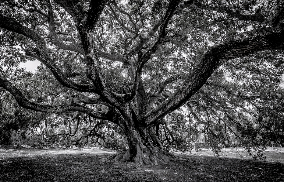 A dramatic black and white canvas capturing the timeless beauty of a sprawling tree with powerful roots and branches.