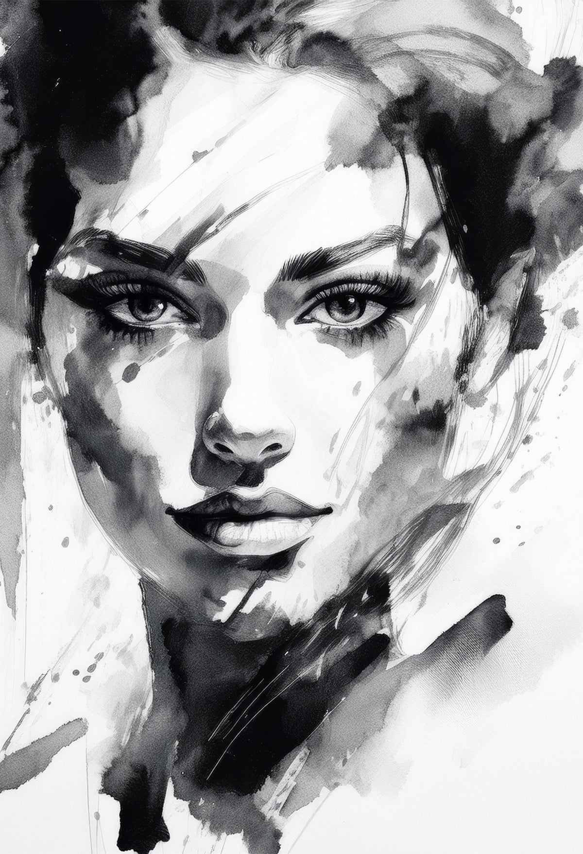 Ethereal Gaze captures the raw emotion and mystery of the human soul through the simplicity of black and white. The soft brush strokes and high-contrast tones draw you into her eyes — calm yet powerful, delicate yet unyielding.
