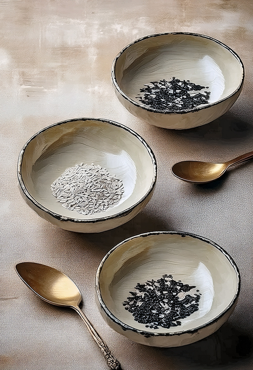 A calming still life that celebrates the beauty of simplicity, featuring handcrafted ceramic bowls, golden spoons, and delicate seeds arranged with elegant balance. The warm neutral tones and soft textures create a serene atmosphere, making this artwork a perfect choice for kitchens, dining rooms, or minimalist interiors.