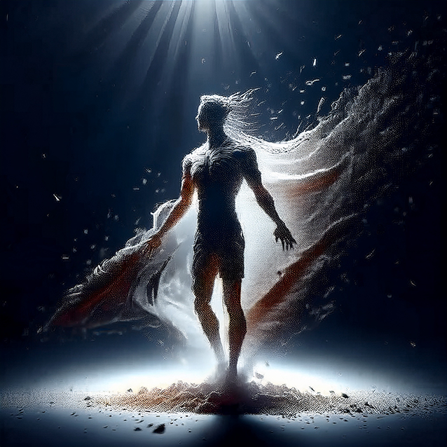 Step into the realm of strength and transcendence with Fragments of Desire. This powerful artwork captures a figure emerging from the shadows, illuminated by radiant beams of light, as fragments scatter like echoes of transformation. The interplay of deep shadows and ethereal highlights creates a dramatic sense of rebirth, resilience, and unstoppable energy.