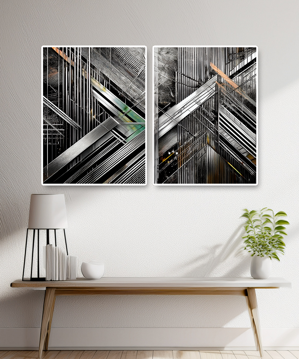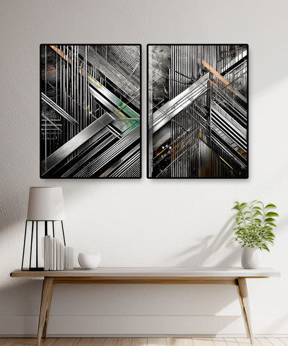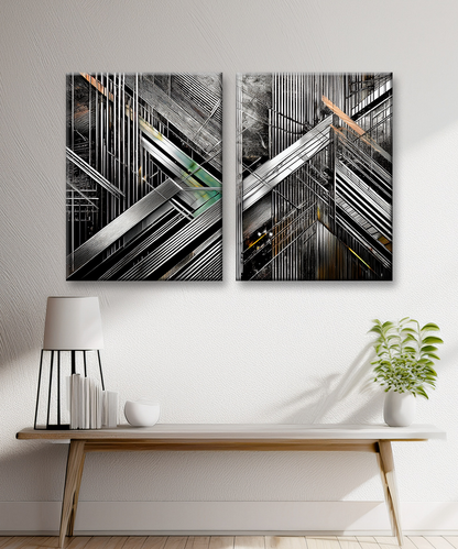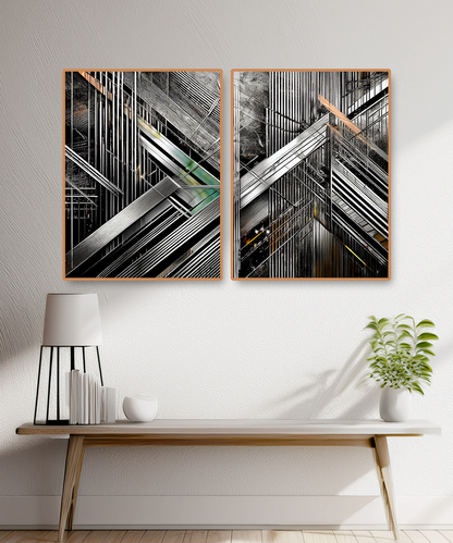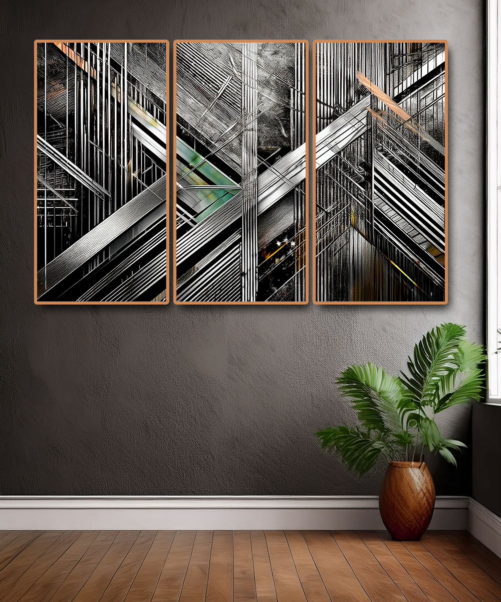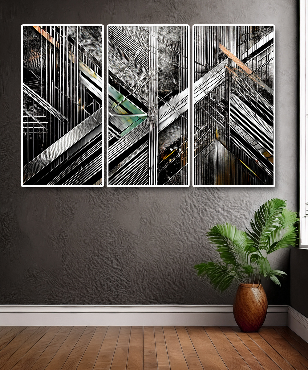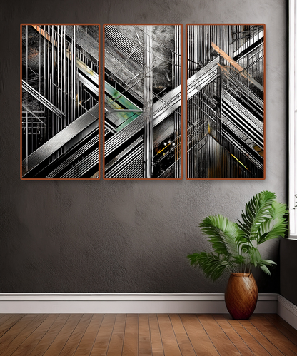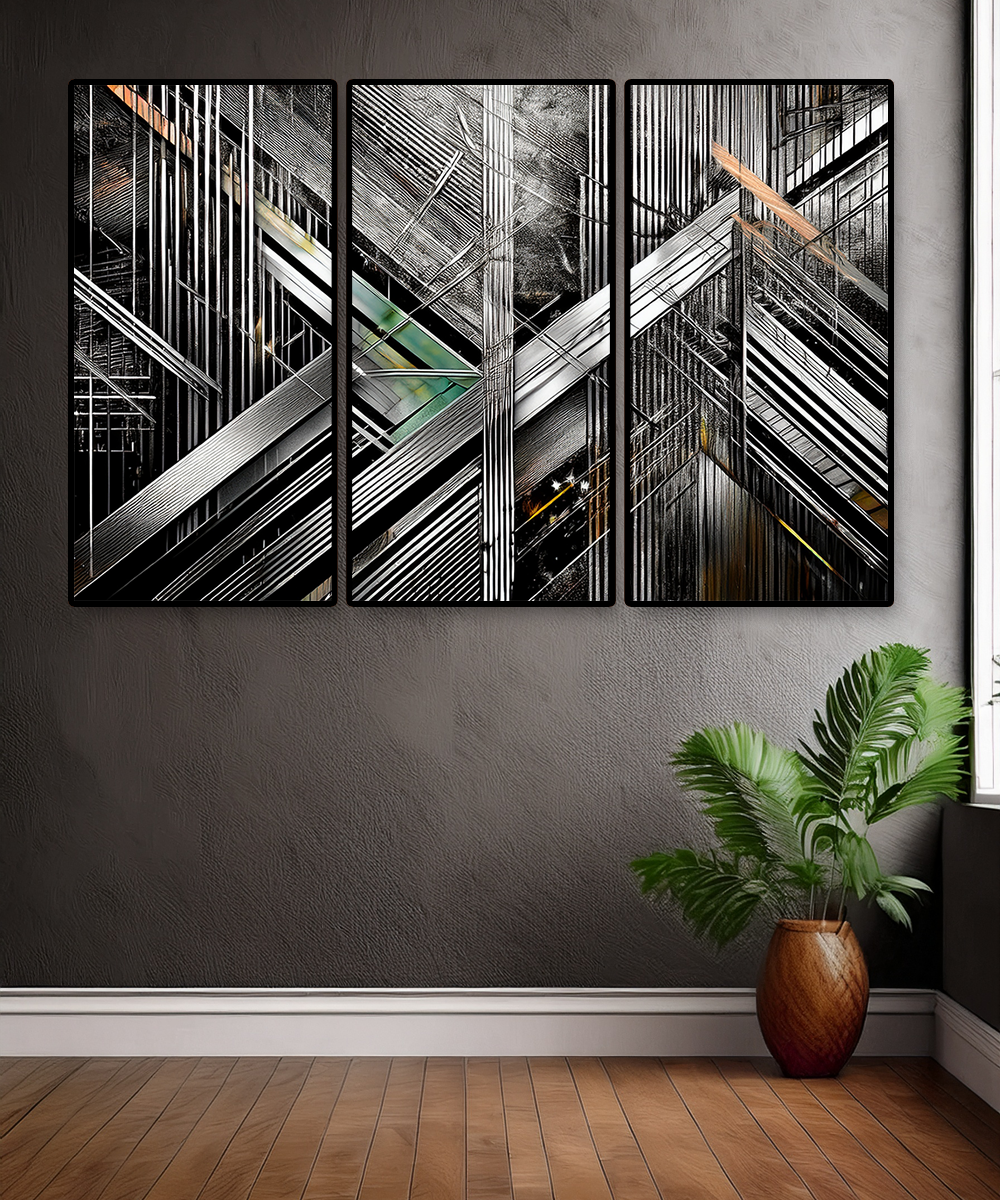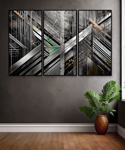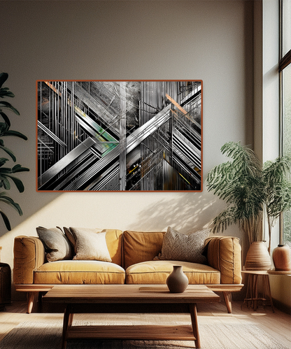 The intersecting forms create a dynamic sense of depth and rhythm, making this piece ideal for contemporary interiors, loft spaces, or offices seeking a powerful focal point. With its sleek contrasts of black, silver, and metallic hues, this artwork resonates with both modern minimalists and geometric art enthusiasts.