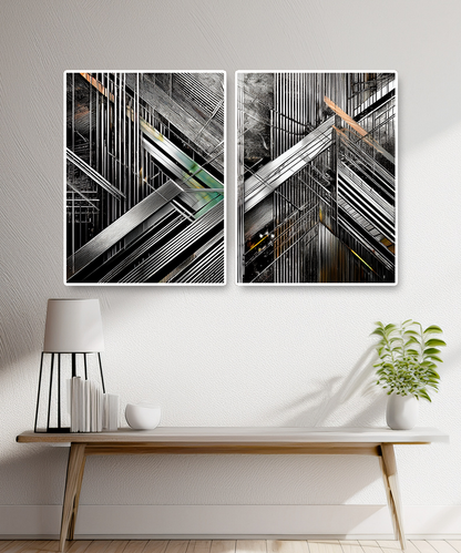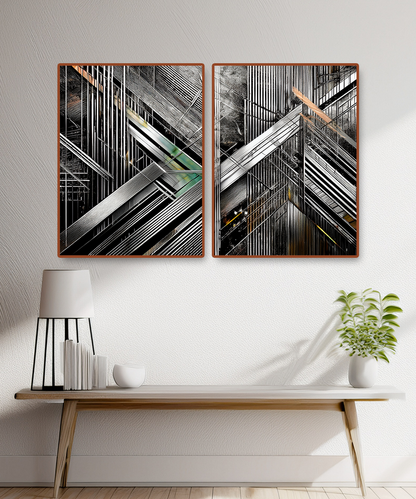 Introduce a striking sense of modernity with the Fully Forged Geometry Abstract Line Art Canvas. This artwork is a bold composition of metallic lines, sharp angles, and layered textures, evoking the precision and strength of industrial design while maintaining the elegance of minimalism.
