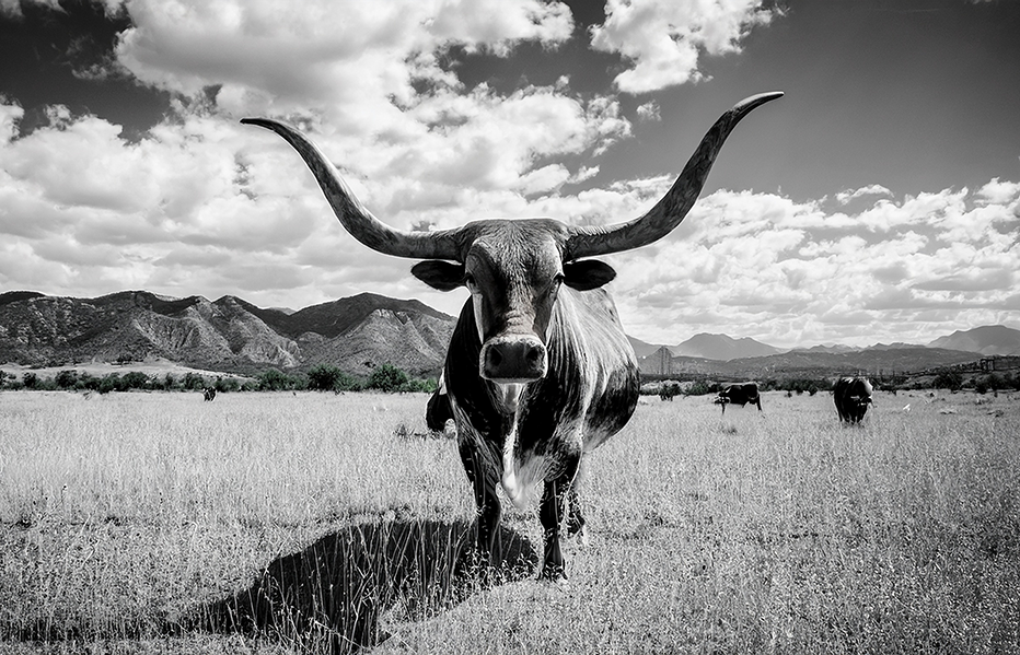 A striking black and white longhorn bull standing tall in open fields, symbolizing strength, endurance, and freedom.
