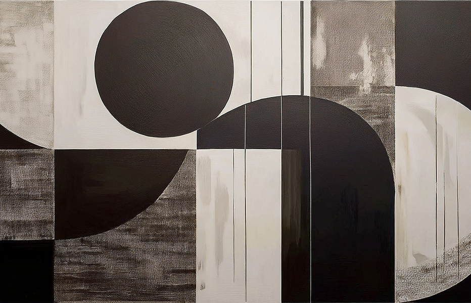 Bold black and white geometric shapes create a striking monochrome abstract with modern minimalist elegance.