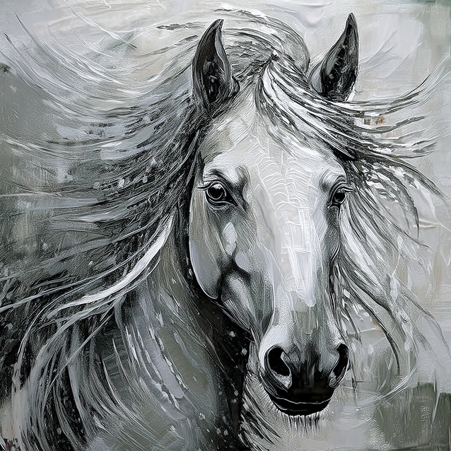 Silent Grace captures the quiet power and elegance of the horse in a striking grayscale composition. Flowing strands of mane blend seamlessly into a swirling abstract background, while the expressive gaze and detailed textures evoke motion, vitality, and depth. This piece is a tribute to strength held in stillness—where every brushstroke whispers of freedom, dignity, and untamed spirit.