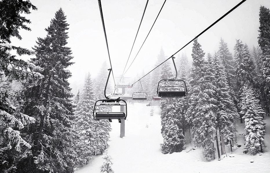 A serene snowy mountain scene with a ski lift gliding above frosted pine trees, capturing the beauty of winter.