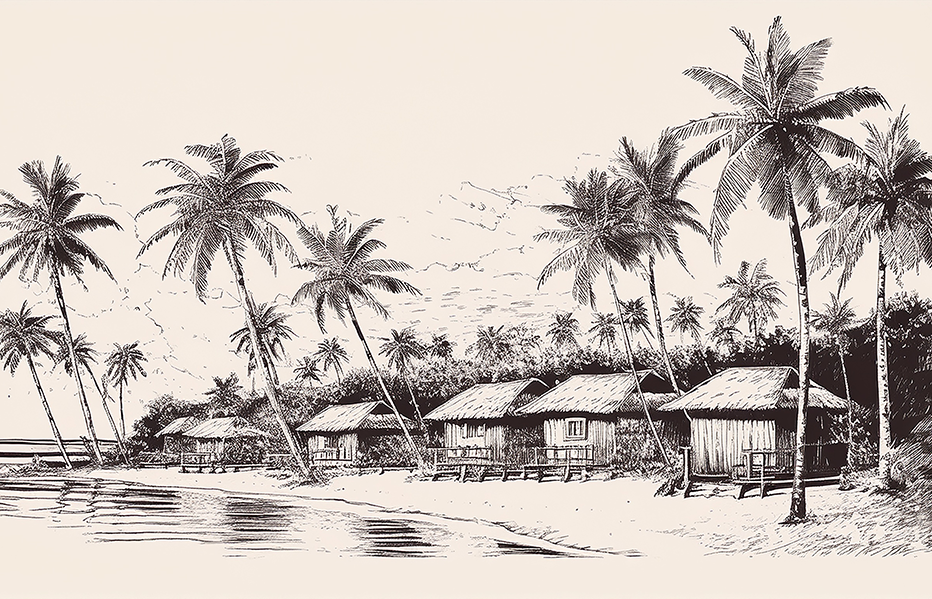Bring the calm of island life into your home with this Tropical Beach Canvas Wall Art, a finely detailed black-and-white sketch featuring palm trees and traditional village huts along the shoreline. The hand-drawn style captures the timeless charm of coastal living, making it a perfect piece for beach-inspired interiors.