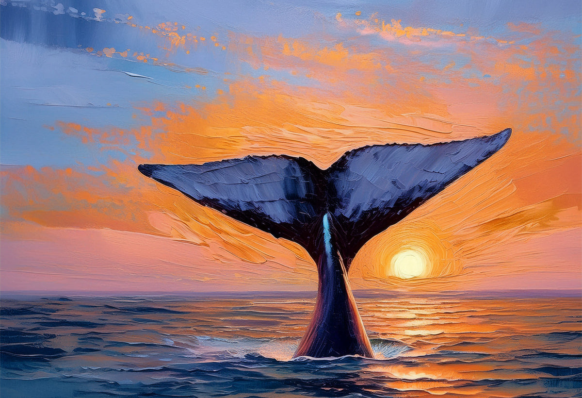Whale at Sunset II brings to life the breathtaking moment when a whale’s tail breaks through the glowing surface of the sea at dusk. Rich oil-paint textures and radiant orange-blue tones create an atmosphere of power, freedom, and serenity.